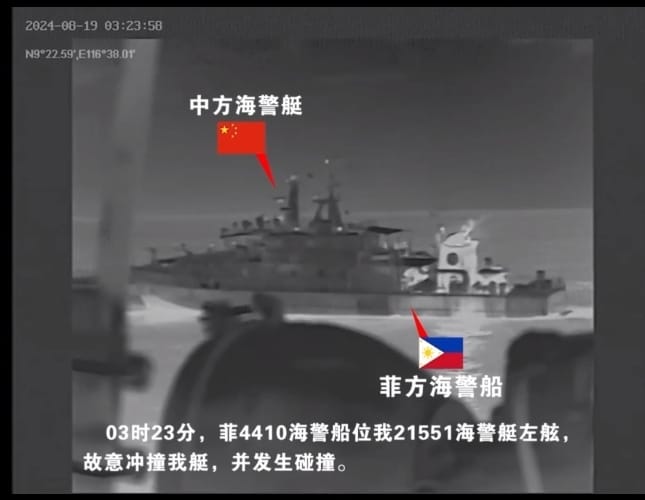 منگل کے روز چینی میڈیا کے مطابق جائے وقوعہ سے حاصل ہونے والی ویڈیو میں دیکھا جا سکتا ہے کہ فلپائن کے جہاز نے چین کی بار ہا انتباہ کو نظر انداز کرتے ہوئے جان بوجھ کر قانون نافذ کرنے والے چینی کوسٹ گارڈ کے جہاز کو خطرناک انداز میں ٹکر ماری جس کے نتیجے میں تصادم ہوا۔ مقامی اور بین الاقوامی قوانین کے مطابق ، چائنا کوسٹ گارڈ نے فلپائن کے جہاز کے خلاف ضروری اقدامات اٹھائے ہیں جو پیشہ ورانہ ، محدود اور معیاری ہیں۔