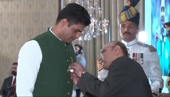 تفصیلات کے مطابق ایوان صدر میں اولمپک گولڈ میڈلسٹ ارشد ندیم کو ہلال امتیاز عطا کرنے کی تقریب ہوئی جس میں صدر آصف علی زرداری نے فخر پاکستان ارشد ندیم کو ہلال امتیاز عطا کیا۔