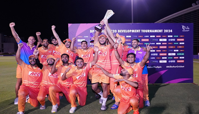 دبئی :گلف جائنٹس ڈیویلپمنٹ نے فائنل میں آئی ایل ٹی 20 پرلز کو 6 وکٹوں سے شکست دیکر ڈی پی ورلڈ آئی ایل ٹی 20 ڈیولپمنٹ ٹورنامنٹ 2024 کا چیمپیئن بننے کا اعزاز حاصل کیا۔ شیول باوا کی شاندار نصف سنچری اور ورتیا اروند، حمید خان اور محمد صغیر خان کی عمدہ کارکردگی کی وجہ سے جائنٹس کو کامیابی ملی۔ یاسر کلیم کی نصف سنچری کی بدولت پرلز نے 5 وکٹوں کے نقصان پر 185 رنز بنائے۔ پرلز کی جانب سے روہن مصطفیٰ نے بالنگ اور بیٹنگ دونوں میں اچھی کارکردگی دکھائی تاہم ان کی ٹیم کو کامیابی نہ مل سکی۔اس مقابلے سے متحدہ عرب امارات کے کھلاڑیوں کو ڈی پی ورلڈ آئی ایل ٹی 20 سیزن 3 کے 6 اسکواڈز میں جگہ بنانے کا موقع ملا ہے جس کا ڈرافت 23 اکتوبر کو ہوگا جس میں 12 کھلاڑی چنے جائیں گے۔ جائنٹس کے رنز کے تعاقب میں روہن مصطفیٰ نے محمد عرفان اور سمل اداونتھا کی وکٹیں حاصل کیں۔ جائنٹس کے کپتان ورتیا اروند کے ساتھ شیول باوا نے بھی 80 رنز کی اہم شراکت قائم کی۔حمید خان نے بھی 13 گیندوں پر 27 رنز کی تیز اننگز کھیلی جس کے بعد انہیں 16 ویں اوور میں روہن مصطفیٰ نے آؤٹ کیا۔ اس کے بعد شیوال باوا نے محمد صغیر خان کی 11 گیندوں پر 33 رنز کی شاندار اننگز کی مدد کی جس کی بدولت جائنٹس نے 19 اوورز میں ہدف حاصل کر لیا۔ڈی پی ورلڈ آئی ایل ٹی 20 ڈیویلپمنٹ ٹورنامنٹ 2024 کا دوسرا ایڈیشن مکمل ہونے کے ساتھ ہی کچھ باصلاحیت کھلاڑی بھی سامنے آئے ہیں۔ آئی ایل ٹی 20 تھنڈر بولٹس کی کے رئیس احمد 307 رنز بنا کر ٹورنامنٹ کے ٹاپ اسکورر رہے جبکہ عزیر خان 16 لیکر سب سے زیادہ وکٹیں حاصل کرنے والے بالر بنے۔