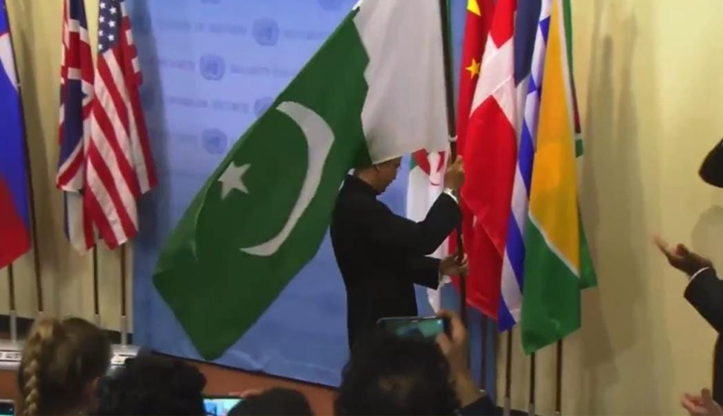 اقوام متحدہ میں سلامتی کونسل کے غیر مستقل ارکان کی ذمہ داریاں سنبھالنے کی تقریب ہوئی، پاکستان کے ایڈیشنل مستقل مندوب عاصم افتخار نے سلامتی کونسل میں پاکستان کا پرچم لگا دیا، پاکستان دو سال تک اپنی ذمے داریاں نبھائے گا، دیگر غیر مستقل ارکان ڈنمارک، یونان، پاناما اور صومالیہ کے پرچم بھی لگائے گئے۔
