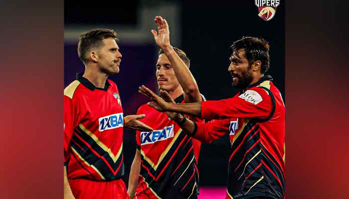 دبئی :دبئی انٹرنیشنل اسٹیڈیم میں کھیلے گئے میچ میں ڈیزرٹ وائپرز نے گلف جائنٹس کو 6 وکٹوں سے شکست دیکر مسلسل دوسری فتح اپنے نام کرلی۔ آل راؤنڈر سیم کرن کی 42 رنز کی ناقابل شکست اننگز نے ڈیزرٹ وائپرز کے لئے تعاقب کو آسان کردیا شیرفین ردرفورڈ نے 18 گیندوں پر 40 رنز بنا کر وائپرز کو 17.4 اوورز میں فتح دلائی۔وائپرز کے تیز گیند بازوں نے پہلی اننگز پر راج کیا کپتان لوکی فرگوسن اور محمد عامر نے بالترتیب 3 اور 3 وکٹیں حاصل کیں۔