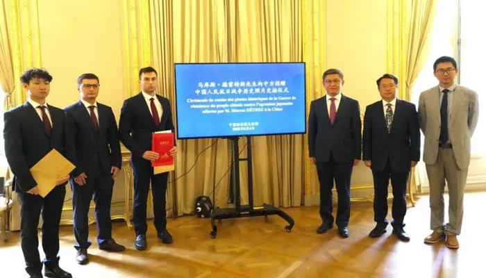 فرانس میں چینی سفارت خانے کے زیراہتمام فرانسیسی دوست مارکس ڈریٹس کی جانب سے جاپان مخالف جنگ کی تاریخی تصاویر چین کے حوالے کرنے کی تقریب منعقد کی گئی۔ اطلاعات کے مطابق مارکس نے اپنے آنجہانی نانا راجر پیئر لارنس کی جانب سے جمع کی گئی 618 تاریخی تصاویر شنگھائی سونگ حو اینٹی جاپانی وار میموریل ہال کو عطیہ کی ہیں۔