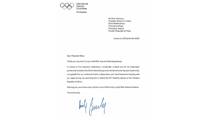 بیجنگ : بین الاقوامی اولمپک کمیٹی کی صدر سیورین کووینٹری نے چائنا میڈیا گروپ کو ایک تہنیتی خط ارسال کیا، جس میں انہوں نے سی ایم جی کے تمام ملازمین کو وسط خزاں تہوار کی مبارکباد پیش کی۔سی ایم جی کے صدر شین ہائی شیونگ کے نام ارسال کردہ خط میں، صدر کووینٹری نے کہا کہ ” اس خوشی کے موقع پر، میں آپ کا شکریہ ادا کرنا چاہتی ہوں! چائنا میڈیا گروپ اور بین الاقوامی اولمپک کمیٹی کے درمیان معنی خیز دوستانہ شراکت داری قابل فخر ہے، اور دونوں فریقوں کے درمیان مسلسل اور ثمر آور تعاون قابل اطمینان ہے۔ میں عوامی جمہوریہ چین کے پندرہویں قومی کھیلوں کے دوران آپ سے دوبارہ ملاقات کی منتظر ہوں۔ میں آپ، آپ کے اہل خانہ، اور سی ایم جی کے تمام ساتھیوں کو وسط خزاں تہوار کی مبارکباد پیش کرتی ہوں، آپ کا خاندان خوشحال ہو!