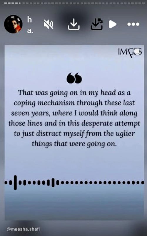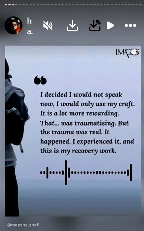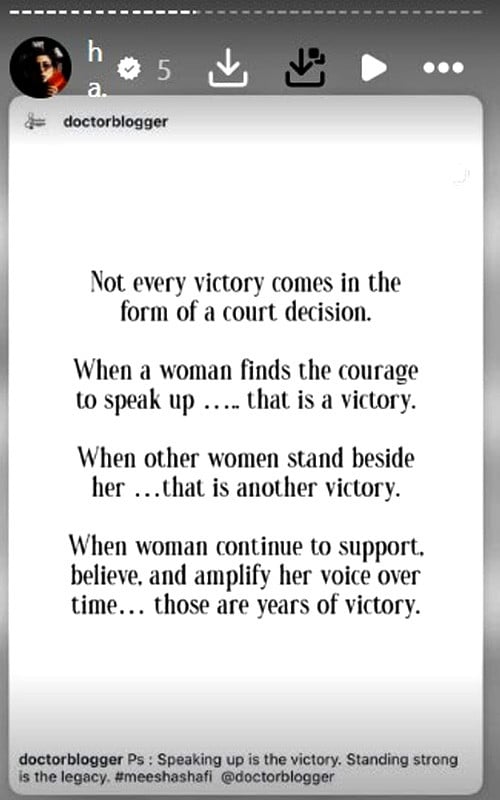 عدالتی فیصلے کے بعد میشا شفیع نے انسٹاگرام پر متعدد اسٹوریز شیئر کیں، جن میں انہوں نے خواتین کے حوصلے اور خودمختاری سے متعلق شاعری پوسٹ کی۔ اپنے پیغام میں انہوں نے اس بات کا عندیہ دیا کہ وہ اس مشکل مرحلے کو ایک ذاتی صدمہ سمجھتے ہوئے اب اپنی توانائی کو خود کو سنبھالنے اور آگے بڑھنے پر مرکوز کریں گی۔